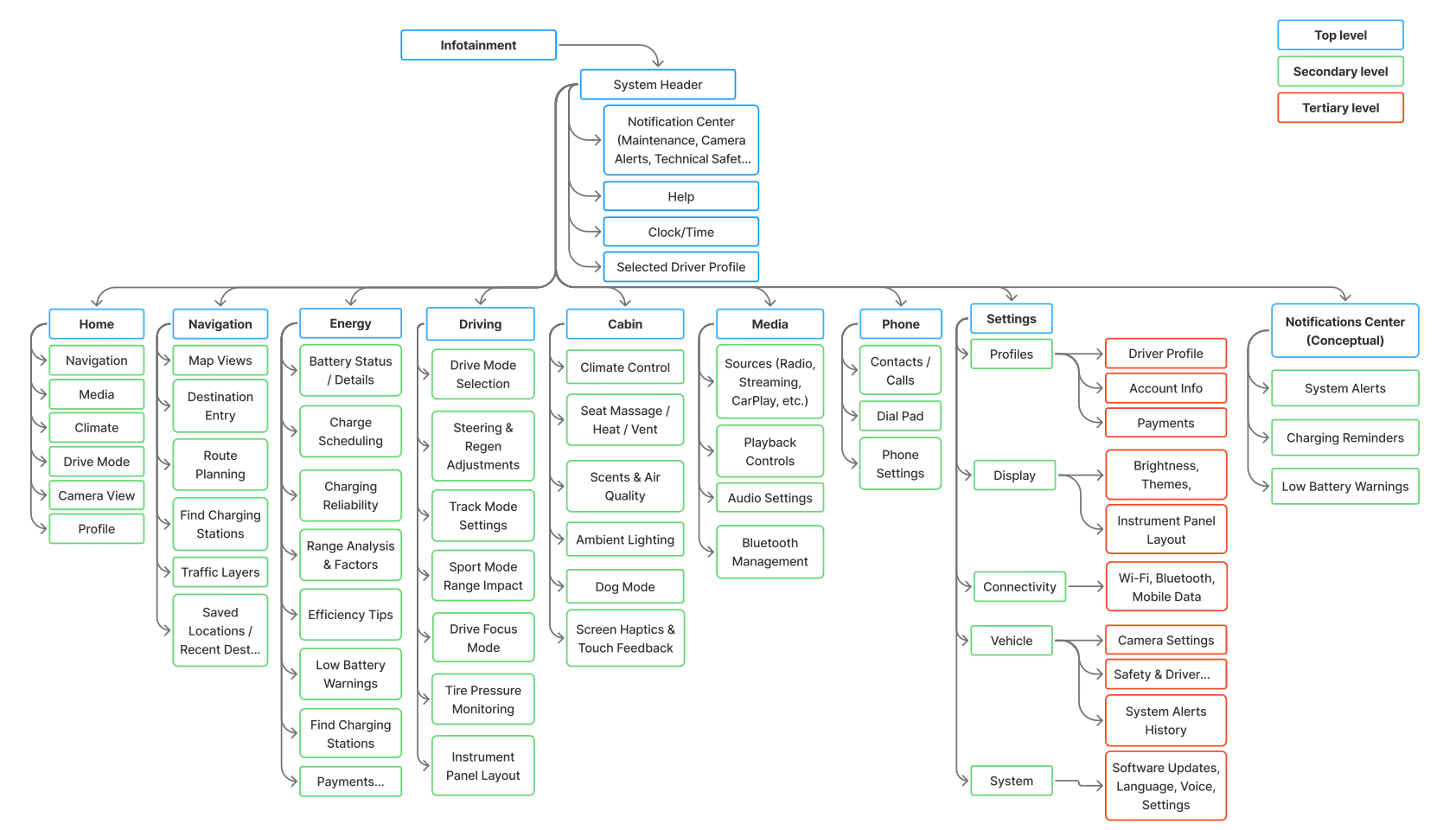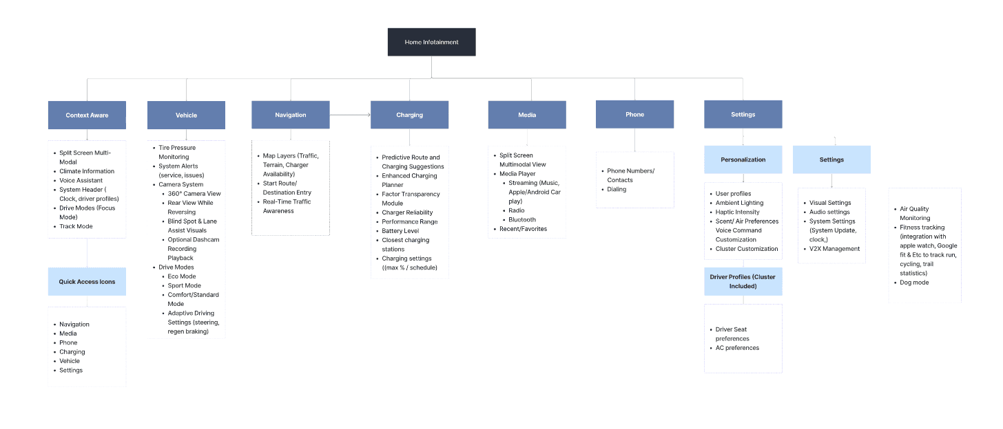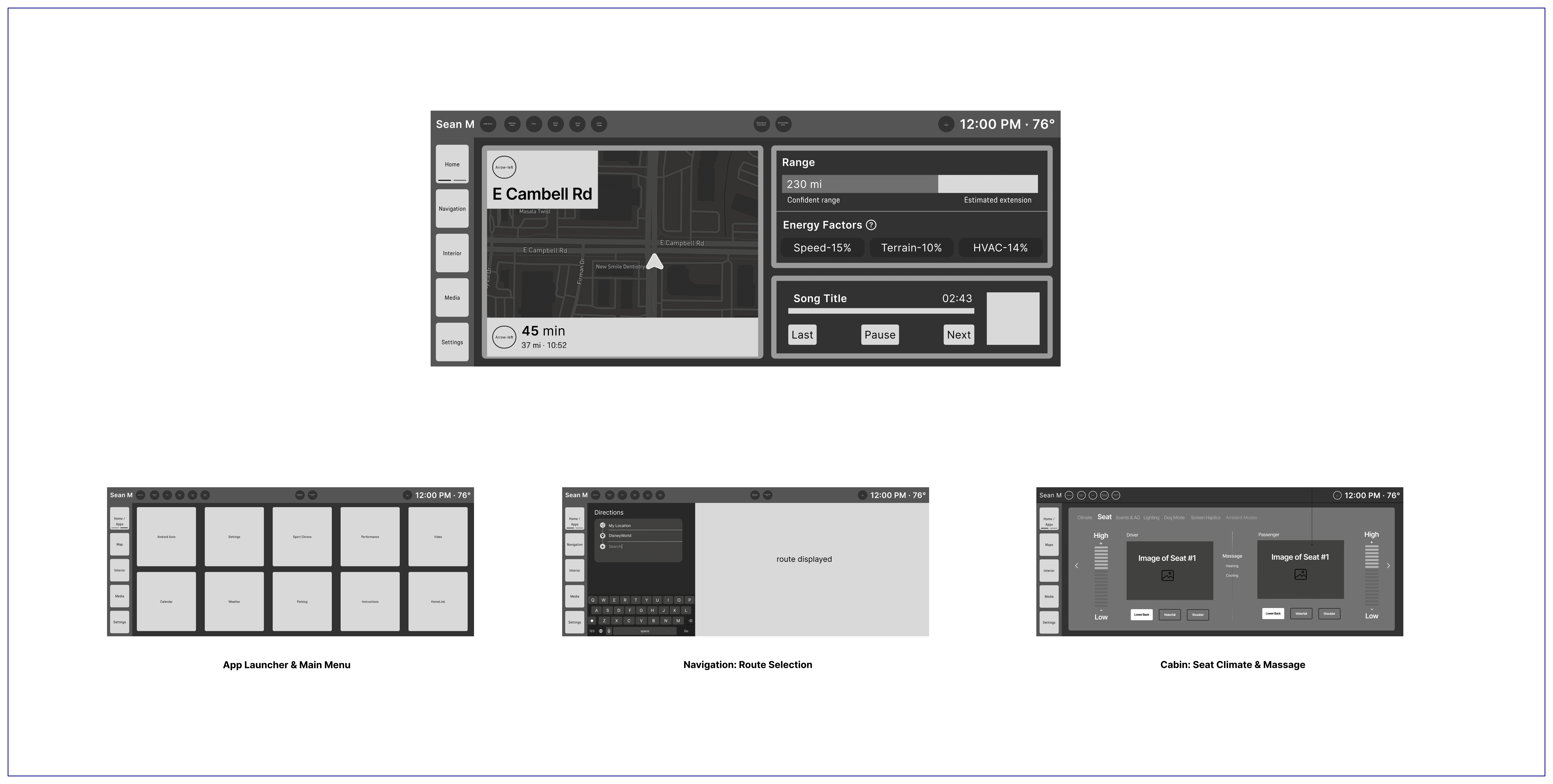 Using the validated IA as a foundation, I collaborated with the in-car team to define key screens such as the driver home, app launcher, route selection, and cabin controls. The wireframes feature a persistent IA dock and a cross-domain dashboard that surfaces navigation, energy, and media at a glance, ensuring alignment with the Trip Planner and overall EV ecosystem.
